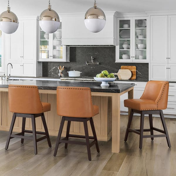Zoi 26 in. Wood 360 Free Swivel Upholstered Bar Stool with Back, Performance Fabric in PU Brown. (Set of 3)
