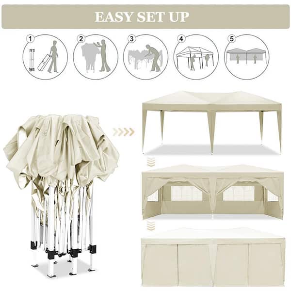 10 ft. x 20 ft. Beige Pop Up Canopy, Outdoor Folding Shelter Tent with 6-Removable Sidewall, 4-Weight Bag and Carry Bag