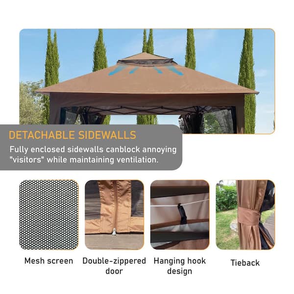 11 ft. x 11 ft. Brown Pop Up Double Top Gazebo Canopy With Removable Mesh Zipper Sidewalls and Carrying Bag