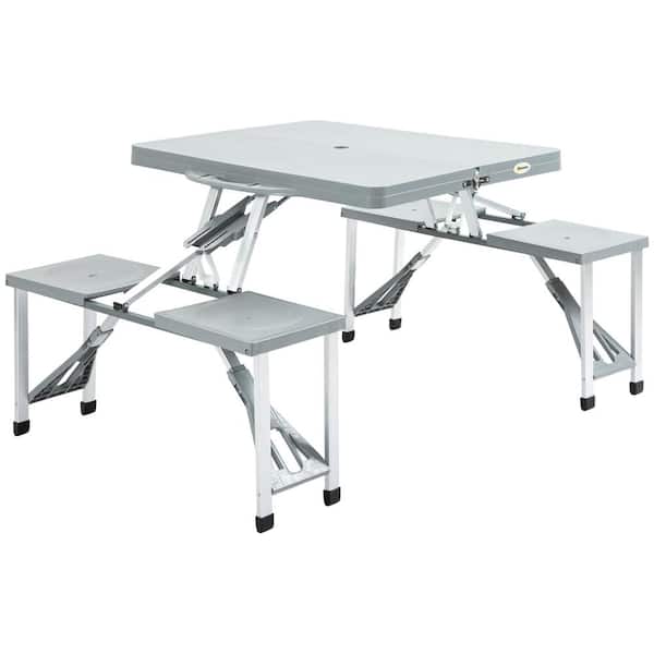 53.5 in. Gray Rectangle Aluminum Picnic Table Seats 4 People with Umbrella Hole, Portable Camping Chairs Set