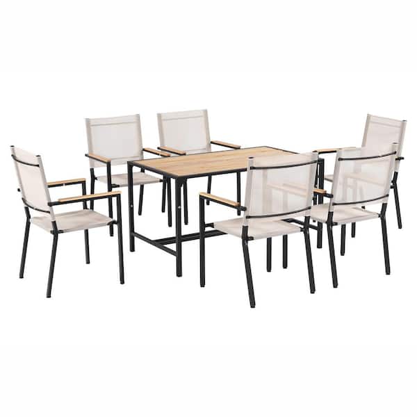 7-Piece Steel Rectangular Outdoor Dining Set, Acacia Hardwood Dining Table with 6 Arm Chairs and Umbrella Hole