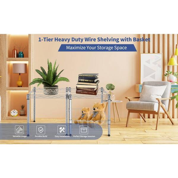 Heavy Duty Shelving Unit, Wire Metal Stackable Storage, 1-Tier Shelf with Basket in Chrome