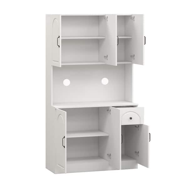 Kitchen Storage Cabinet with Microwave Oven Countertop, Freestanding Hutch Cabinet with Adjustable Shelves in White
