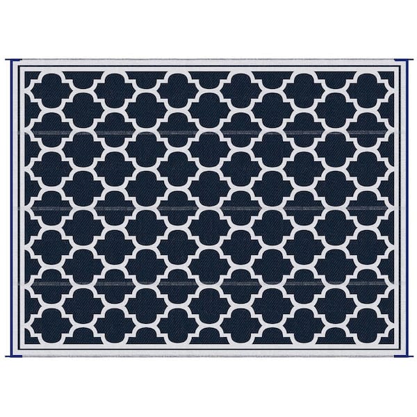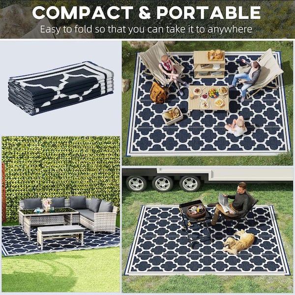 Reversible Outdoor Rug Carpet, 9' x 12' Waterproof Plastic Straw Rug, Portable RV Camping Rugs in Blue & White