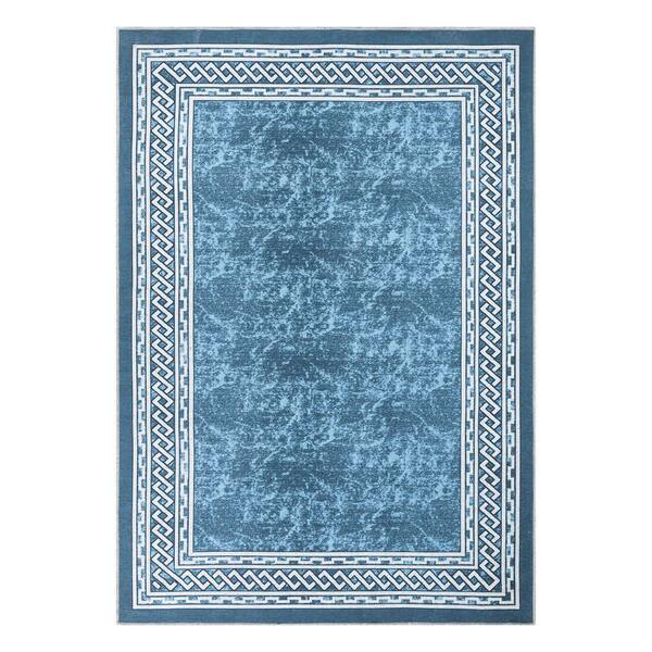 8106-Blue 4 ft. x 6 ft. Non Shedding Washable Wrinkle-free Cotton Flatweave Border Indoor Living Room Area Rug