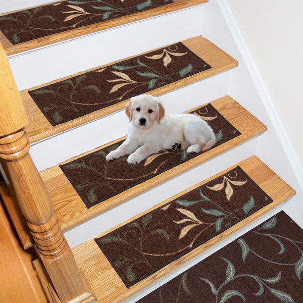 Ottohome Collection Non-Slip Rubberback Leaves Design 8.5 in. x 26 in. Indoor Stair Treads, 14 Pack, Brown