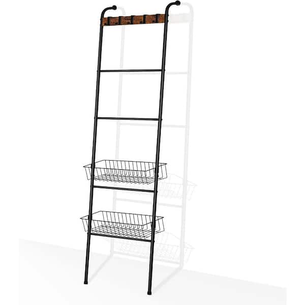Blanket Ladder Black Farmhouse Leaning Towel Ladder Holder with 2 Metal Baskets, 5 Hooks