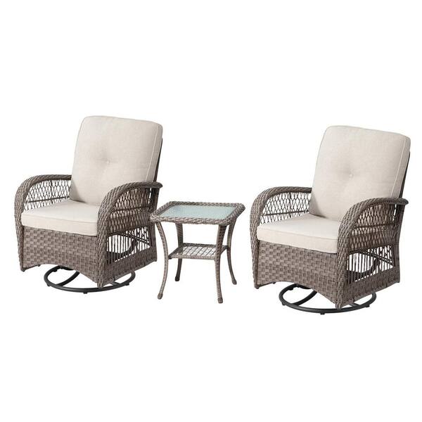 Outdoor 3-Piece Brown Wicker Patio Conversation Set with Beige Cushions, Swivel Rocking Chairs and Glass Top Table Set