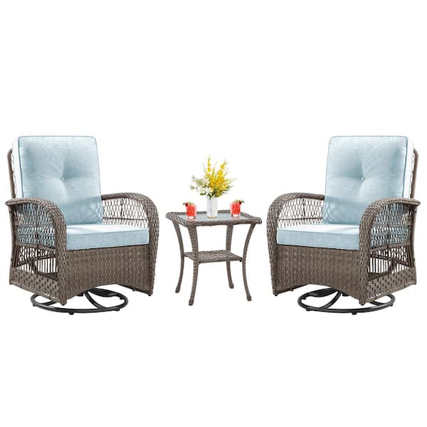 Outdoor 3-Piece Brown Wicker Patio Conversation Set with Light Blue Cushions, Swivel Chairs and Glass Top Table Set