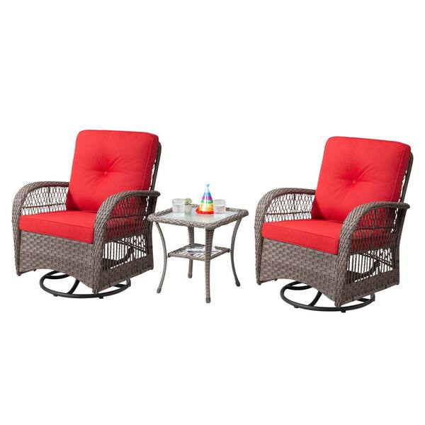 Outdoor 3-Piece Brown Wicker Patio Conversation Set with Red Cushions, Swivel Rocking Chairs and Glass Top Table Set