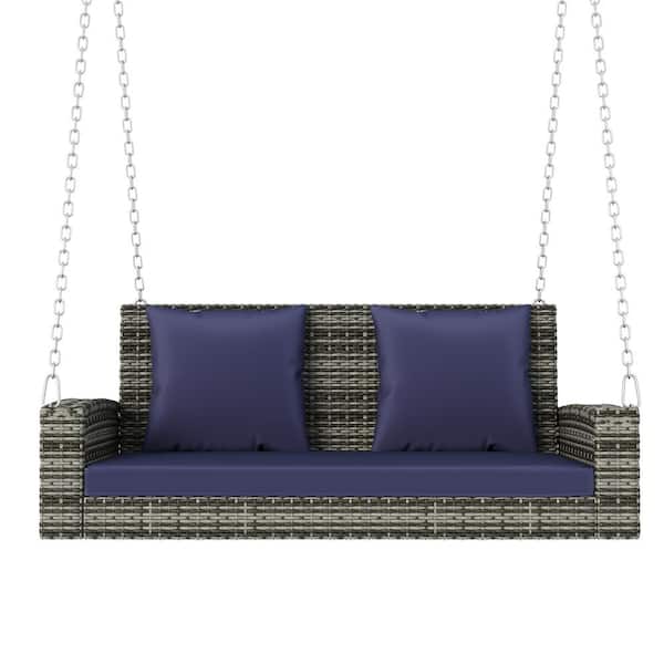 Outdoor 50 in. W 2-Person Patio Gray Wicker Hanging Porch Swing with Chains in Blue Cushions
