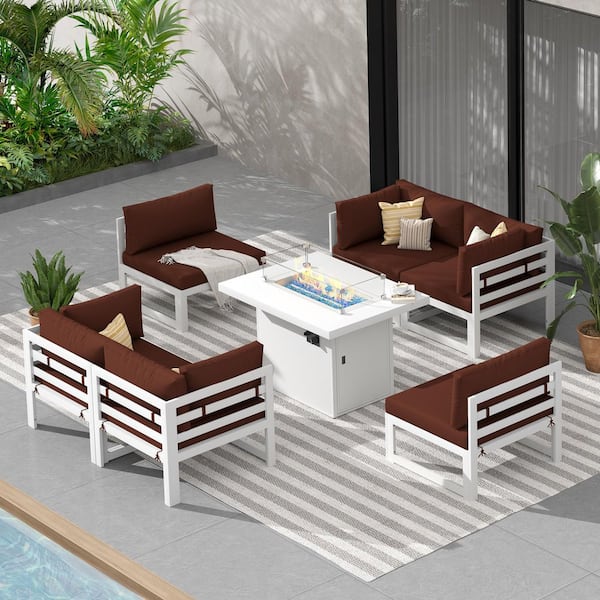 Outdoor 7-Piece White Aluminum Patio Conversation Set Fire Pit Patio Sets with Aluminum Fire Pit Table, Red Cushions