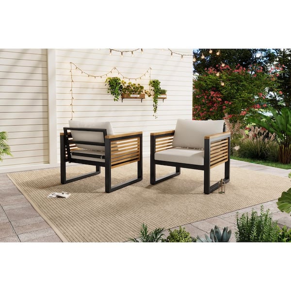 Outdoor Acacia Wood with Metal Patio Chair with Beige Cushions (2-Piece)