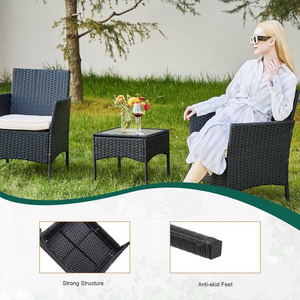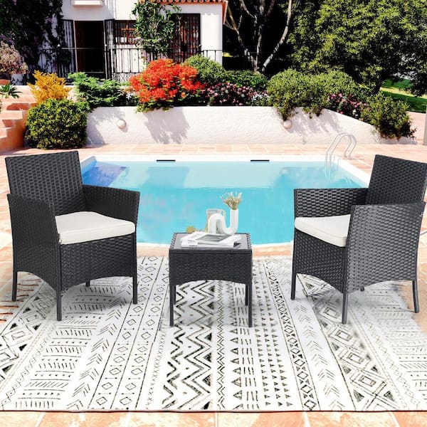 Outdoor Black 3-Piece Wicker Patio Conversation Furniture Bistro Set Porch Chairs with Coffee Table, Cushions Chairs