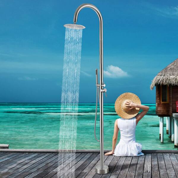 Outdoor Exposed Shower Faucet Single-Handle Freestanding Tub Faucet with Hand Shower in Brushed Nickel