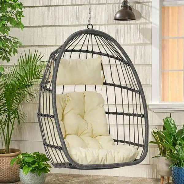 Outdoor Garden Rattan Egg Swing Chair Hanging Chair with Khaki Cushions (No Stand)