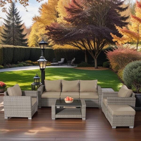 Outdoor Grey 7-Piece Wicker Patio Conversation Set with Grey Cushions