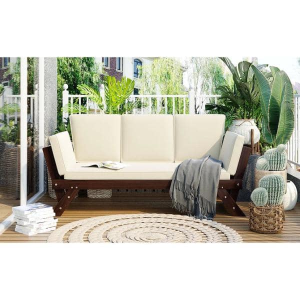 Outdoor/Indoor 1-Piece Wood Outdoor Adjustable Day Bed Sofa with Removable Beige Cushions