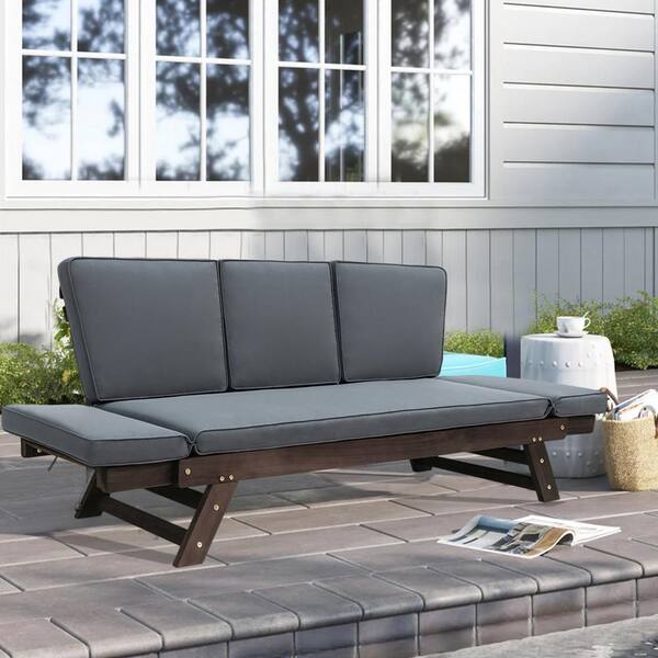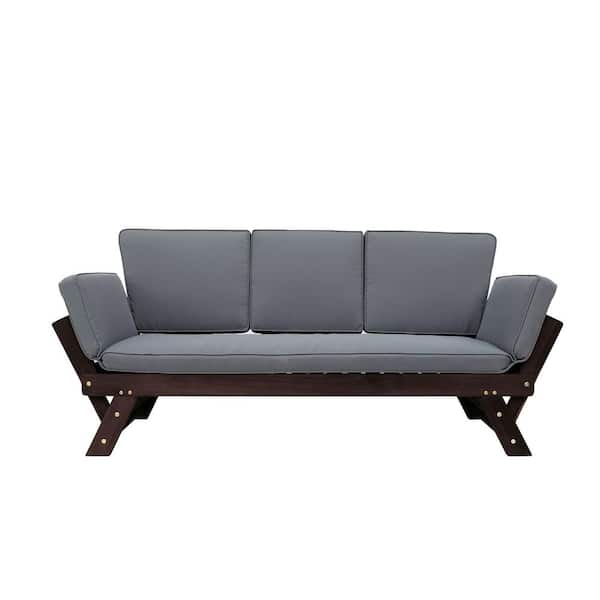 Outdoor/Indoor 1-Piece Wood Outdoor Adjustable Day Bed Sofa with Removable Gray Cushions