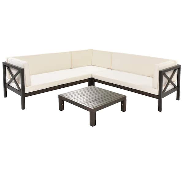 Outdoor Wood Patio Conversation 4-Piece Sectional Seating Group with Beige Cushions and Table X-Back Sofa Set
