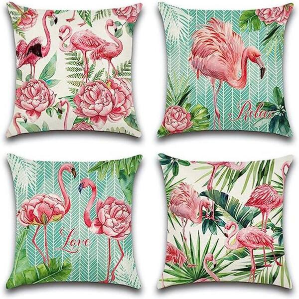 OutdoorSet of 4 Waterproof Throw Pillow Covers 18x18 Inches, Flamingo and Pink Flowers Pattern Decorative Cushion Covers