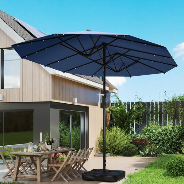 14.4 ft. Double Umbrella, Large Outdoor Patio Umbrella in Blue with Base Included, Patio Sun Shade with LED Solar Light