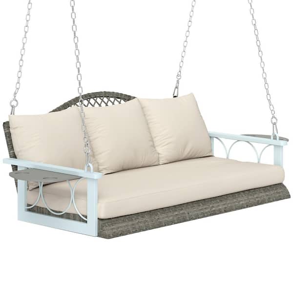2-Person Natural Wood Wicker Hanging Outdoor Porch Swing with Cup Holder, with Cushions and Chains