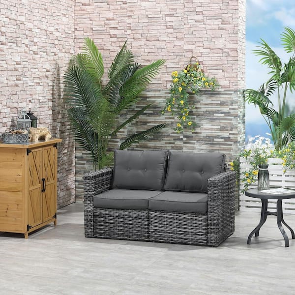 2-Piece Patio PE Rattan Wicker Corner Outdoor Loveseat Sofa Set with Curved Armrests and Padded Grey Cushions