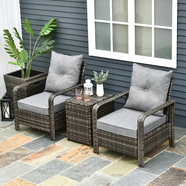 3-Piece Metal PE Rattan Patio Conversation Set with Grey Cushions, 2 Armchairs, and Center Table with Storage