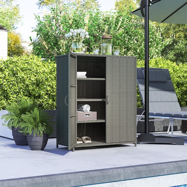 33 in. W x 16 in. D x 40 in. H Dark Gray Wicker Outdoor Storage Cabinet with Shelves, 4-Shelf Outdoor Pool Towel Storage