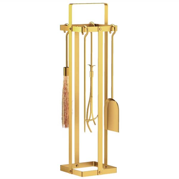 7.9 in x 7.9 in Indoor/Outdoor 5 Piece Metal Fireplace Tools Set with Brush Broom, Poker, Shovel, Tongs and Stand, Gold