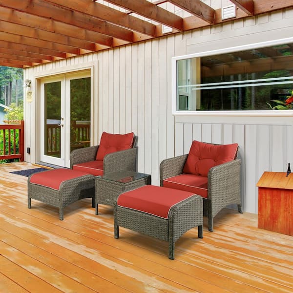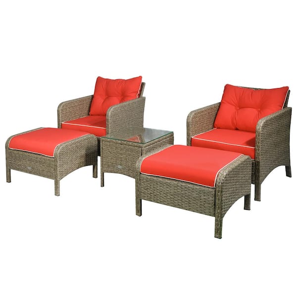 Brown 5-Piece Metal Plastic Rattan Outdoor Sectional Set with Red Cushions and Weather-Resistant Build