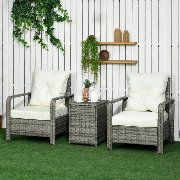 Casual Beige 3-Piece Wicker Outdoor Bistro Set with Storage Table and Beige Cushion