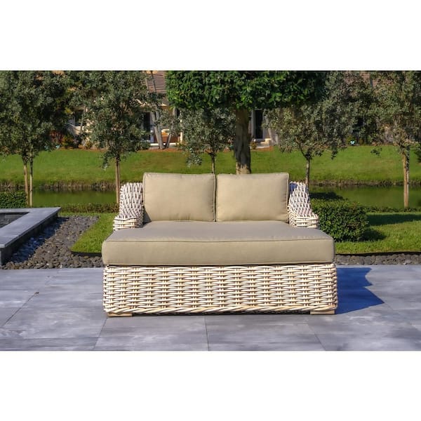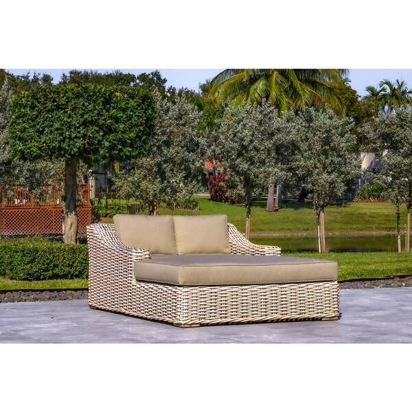 Anna White and Grey 1-Piece Wicker Aluminum Frame Extra Large Outdoor Double Chaise Lounge with Grey Sunbrella Cushions