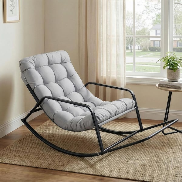 Oversized Gray Metal Outdoor Rocking Chair Papasan Lounge Chair with Grey Padded Cushion