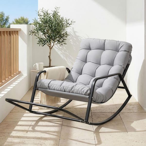 Oversized Gray Metal Outdoor Rocking Chair Papasan Lounge Chair with Grey Padded Cushion