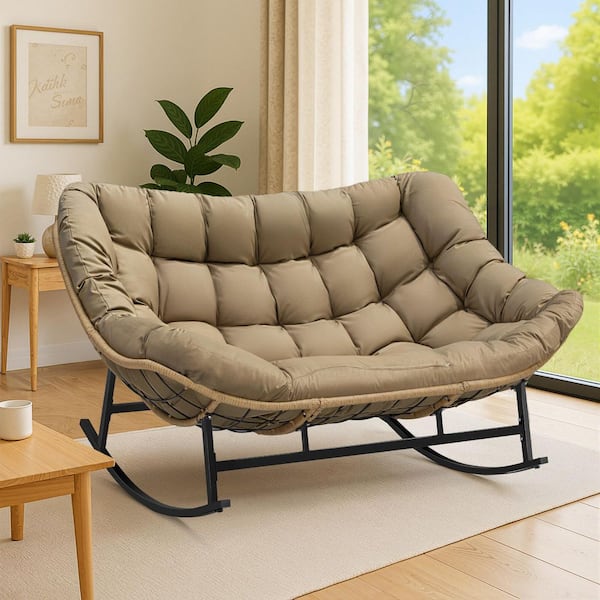 Oversized PE Wicker Double Outdoor Rocking Chair 2-Person 700 lbs. Papasan Chair Loveseat with Brown Cushion