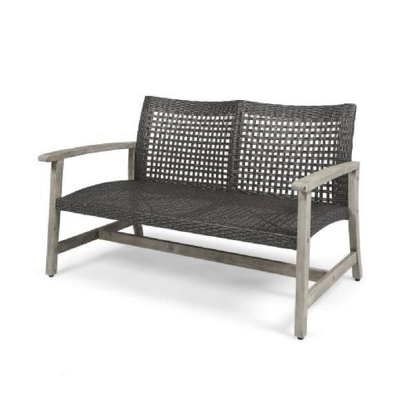 1 Piece Wood Outdoor Loveseat, Acacia Wood Gray Wicker Loveseat, Weather Resistant Outdoor Seating
