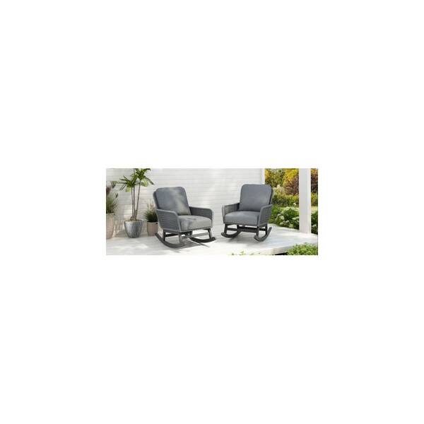 2-Piece Gray Wicker Rattan Outdoor Rocking Chair with Gray Cushion and Wood Frame for Balcony or Backyard
