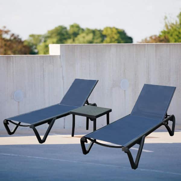 3-Piece Aluminum Outdoor Patio Chaise Lounge Polypropylene Chair with Table & 5 Adjustable Backrest Positions in Blue