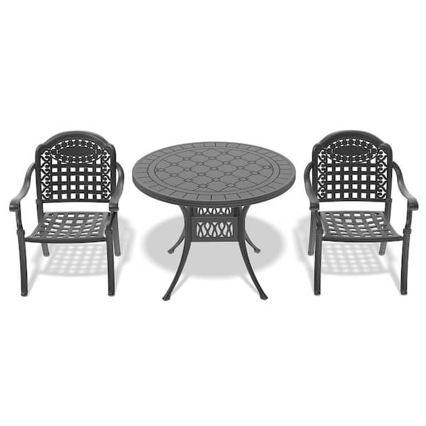 3-Piece Aluminum Patio Conversation Set, Chairs and Tables, Stacking Design Petals and Rectangle Patterns/ Blue Cushions