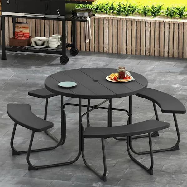 75 in. Black Round Iron Outdoor Picnic Tables Set with Built-in Benches, Umbrella Hole & Waterproof Top, Seats 8 People
