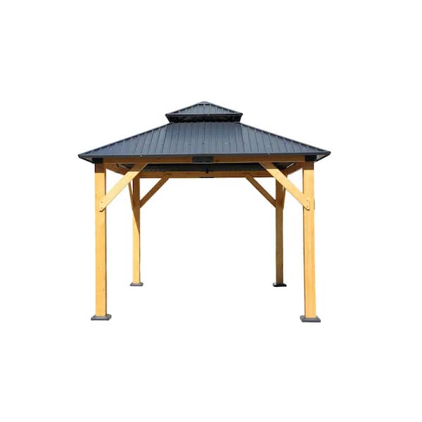 9.67 ft. x 11.81 ft. Brown Wood Carport Pavilion Gazebo, Shade, Rain, Hard Top Steel Double Roof, All Weather Protected