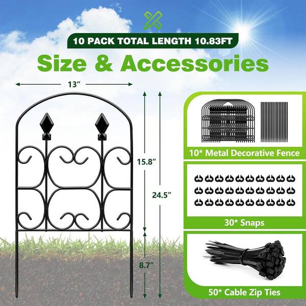 Decorative 24.5in Tall Metal Garden Fence Animal Barrier Black 10 Pack Easy Install Rust Resistant