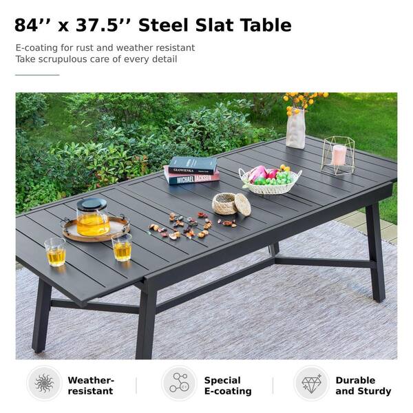 Outdoor Black Rectangular Metal Frame Expandable Dining Table Inclined Leg for Lawn Garden, 6-8 Person