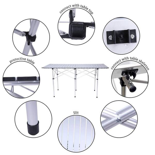 Portable Folding 27.6 in. Silver Rectangular Aluminum Picnic Table Seats 6 People, Compact Roll Top Table with Carry Bag
