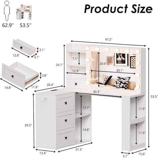 White Makeup Vanity Set with Mirror, Corner Vanity Desk With Lights, 3-Color Lighting, Power Strip Hooks, Hidden Shelves