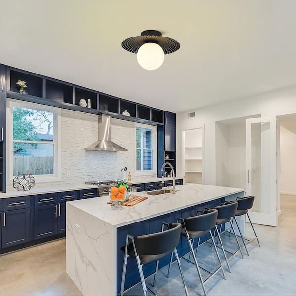 1-Light Black Diffuser Semi-Flush Mount Ceiling Light with Metal Pleated Shade and White Glass Shade