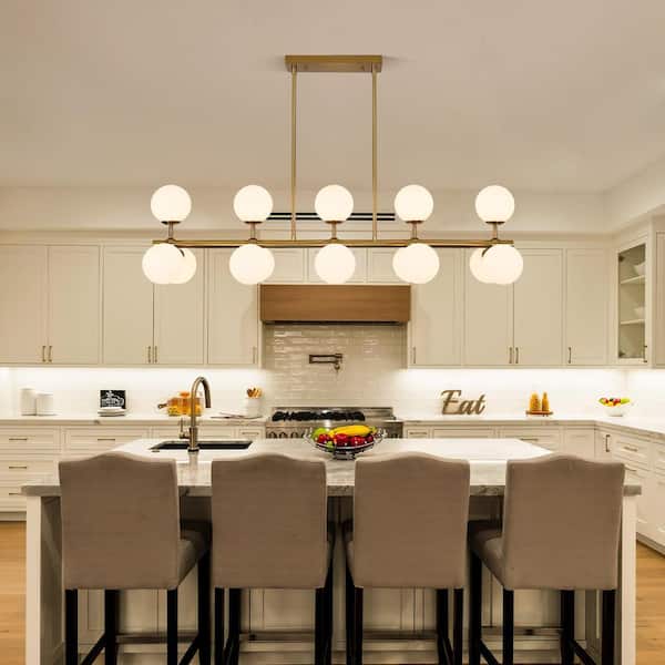 15-Light Gold Linear Sputnik Chandelier with Opal Glass Globe Shade for Dining Room Kitchen Island