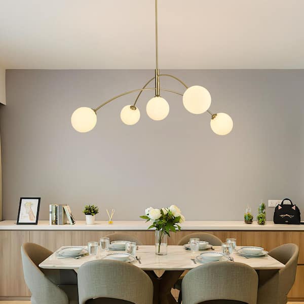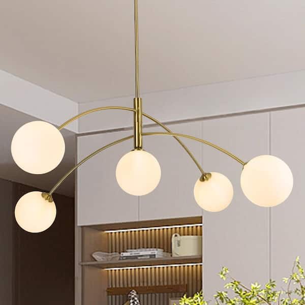 41.3 in. 5-Light Gold Sputnik Chandelier with White Globe Glass Shade for Living Room with No Bulbs Included